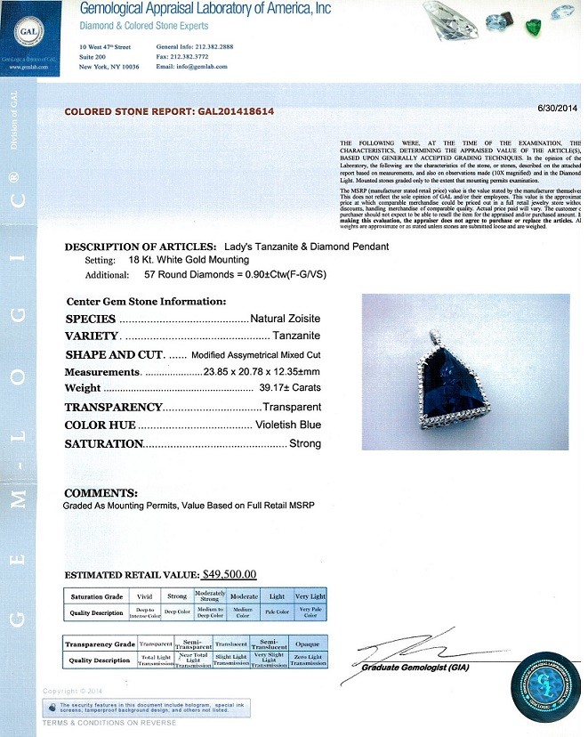 • Asymmetrical Shape Tanzanite and Diamond Necklace Cert 17222