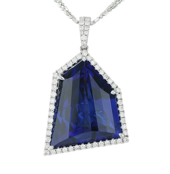 Truly one-of-a-kind, this vibrant tanzanite and diamond necklace showcases an extraordinary 39.17 carat unique asymmetrical shape tanzanite gemstone surrounded by pavé-set diamonds crafted in pure 18k white gold and perfectly complemented by a sparkly triple strand chain necklace. Eye-catching beauty meets classic style.