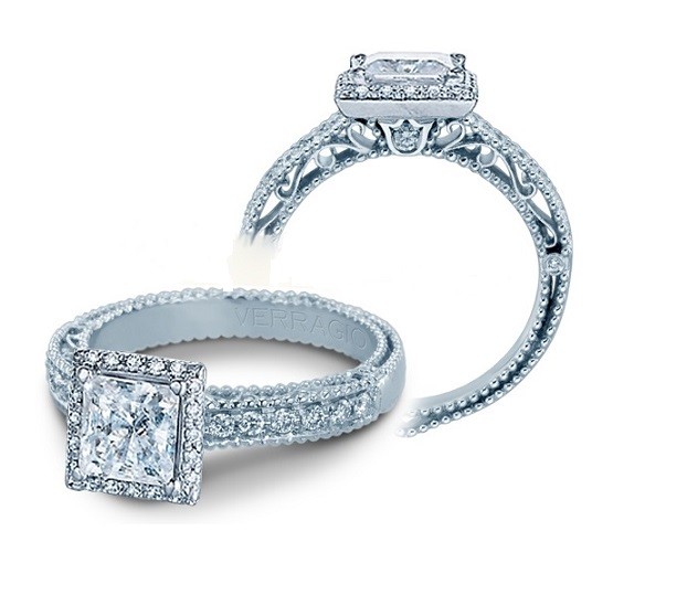 Verragio Venetian diamond engagement ring AFN-5002P from the Venetian Collection features a frame of prong set diamonds to enhance a princess or a cushion cut center. A delicate workmanship and filigree details on the side view of this Verragio Venetian diamond engagement ring evokes the Art Deco era of design.