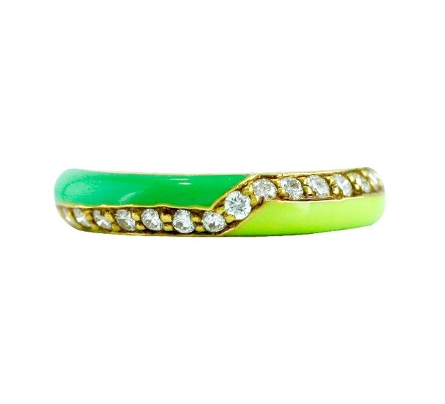 Hidalgo 18k yellow gold ring features green and lime green opaque enamel with diamonds half way around weighing 0.17 carats.