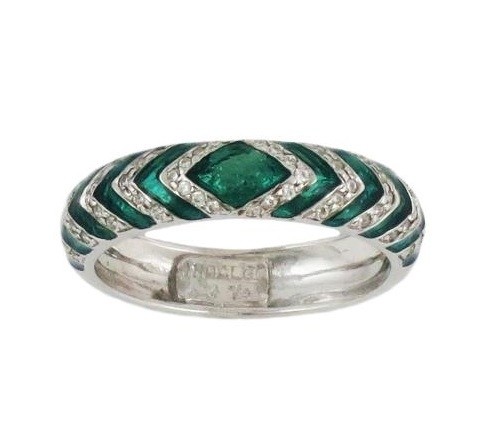 Hidalgo 18k white gold ring features chevron design ocean bluish-green enamel and diamonds 0.25 cts half way around.