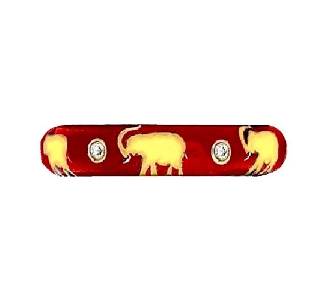 Hidalgo 18k yellow gold ring features red enamel and gold leaf elephants accented with 0.07 carats of round diamonds all around.