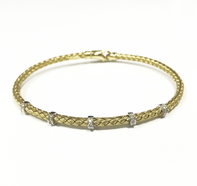 Combining sleek textures and materials, lend a touch of distinction to your look with this woven mesh shimmering diamond flexible bracelet featuring five dazzling diamond-lined collars stationed at regular intervals. Assembled in gleaming 14k yellow and white gold, sport the stacking jewelry trend by adding this diamond flexible bracelet to your wrist.