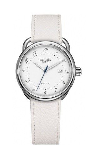 Hermes Arceau MM stainless steel Swiss-made watch, diameter 32 mm, white dial, automatic self winding movement, white grained calf strap with safety folding clasp, deployment buckle.