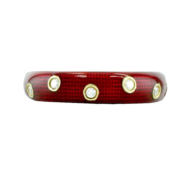 Hidalgo 18k yellow gold ring with red enamel and polka dots and 0.24 cts diamonds all around.