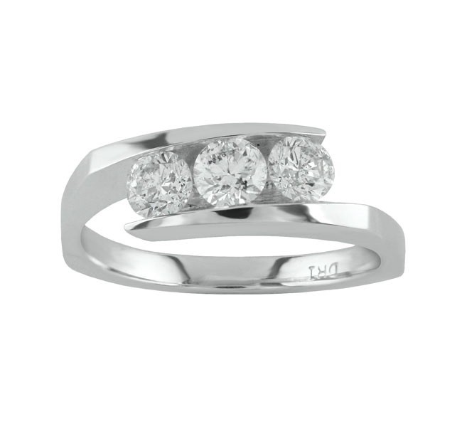Sparkling and beautiful, this three stone bypass diamond ring features stunning round diamonds channel set in a bypass design. Framed in lustrous 14k white gold, this three stone bypass diamond ring is suitable for any occasion.