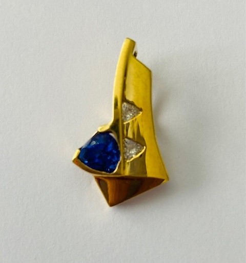 A single sparkling trillion cut tanzanite gemstone is bezel set in this unique trillion tanzanite and trillion diamond pendant complemented by brilliant trillion shape diamonds in-set in it's asymmetrical gold frame. Crafted in rich 18k yellow gold, this exceptional trillion tanzanite and trillion diamond pendant makes a remarkable color fashion statement.